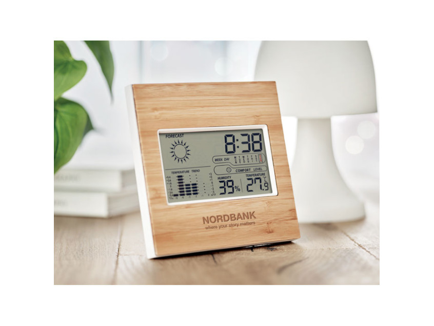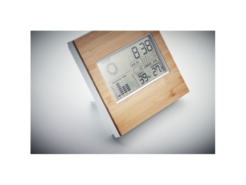 Метеостанция из бамбука. Индикация часов, температуры, влажности и календарь. Нужны отдельно 2 батарейки ААА, в комплект не входят . Бамбук является натуральным продуктом, могут быть небольшие различия в цвете.