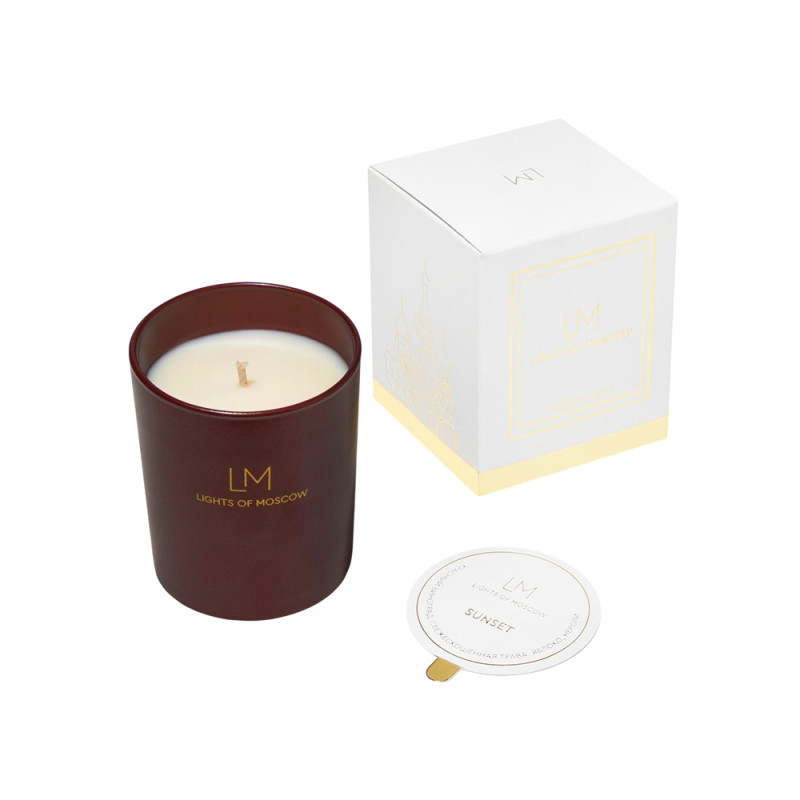 Коллекция аромасвечей Exclusive является уникальной не только из-за ароматов коллекции, но и благодаря тщательно разработанному дизайну упаковки, которая является напоминанием о том, что бренд Lights of Moscow - это ручное российское производство в самом центре Москвы. Белая коробка оформлена ярким золотым фольгированием, на левой стороне которой изображен Храм Василия Блаженного - одна из главных достопримечательностей на Красной площади в Москве.