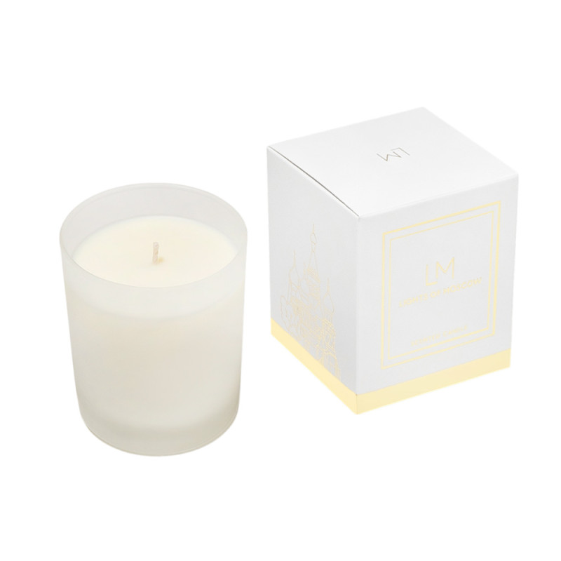 Коллекция аромасвечей Exclusive является уникальной не только из-за ароматов коллекции, но и благодаря тщательно разработанному дизайну упаковки, которая является напоминанием о том, что бренд Lights of Moscow - это ручное российское производство в самом центре Москвы. Белая коробка оформлена ярким золотым фольгированием, на левой стороне которой изображен Храм Василия Блаженного - одна из главных достопримечательностей на Красной площади в Москве.