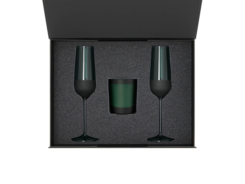 Подарочный набор свеча Enigma + 2 бокала для шампанского Emerald в черной коробке