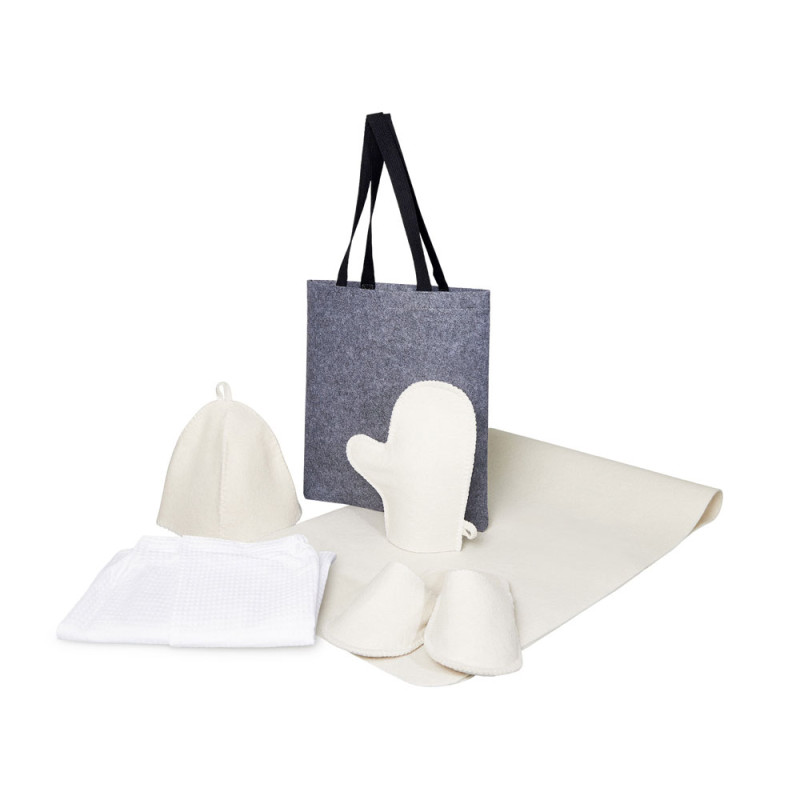 Банный набор Healing для настоящего ценителя сауны: коврик-лежак, мужской вафельный килт, рукавица, шапка, тапочки — всё в стильном фетровом шоппере.