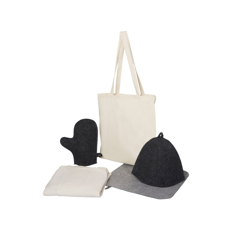Создайте уют в парной: женский холщовый килт, шапка, коврик и рукавица — всё необходимое для отдыха, аккуратно сложено в хлопковый шоппер.