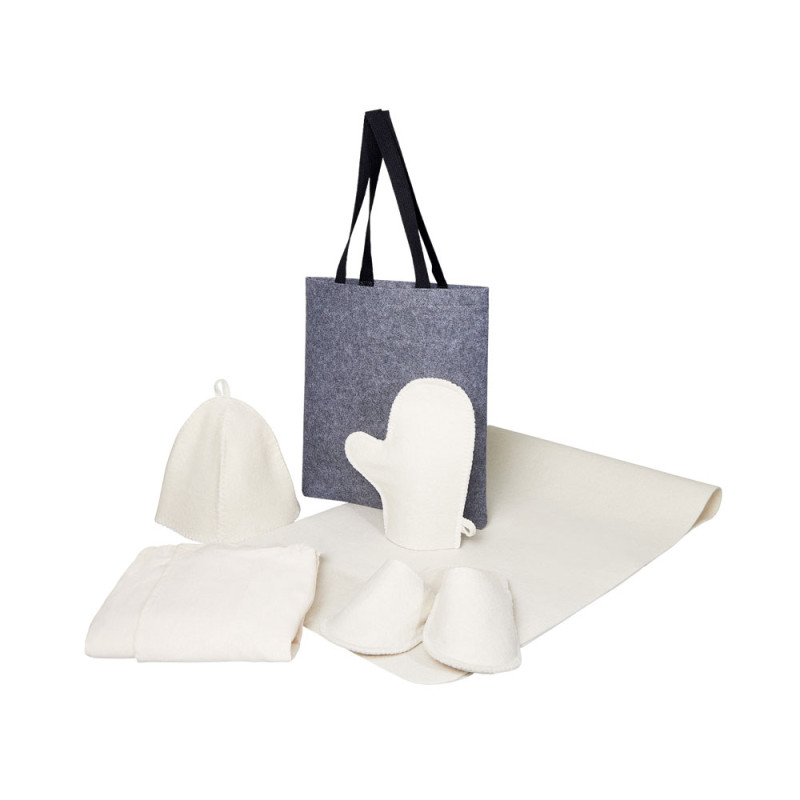 Женский банный набор Healing для комфортного отдыха: лежак для бани, холщовый килт-парео, рукавица, шапка и тапочки — всё аккуратно упаковано в стильный фетровый шоппер.