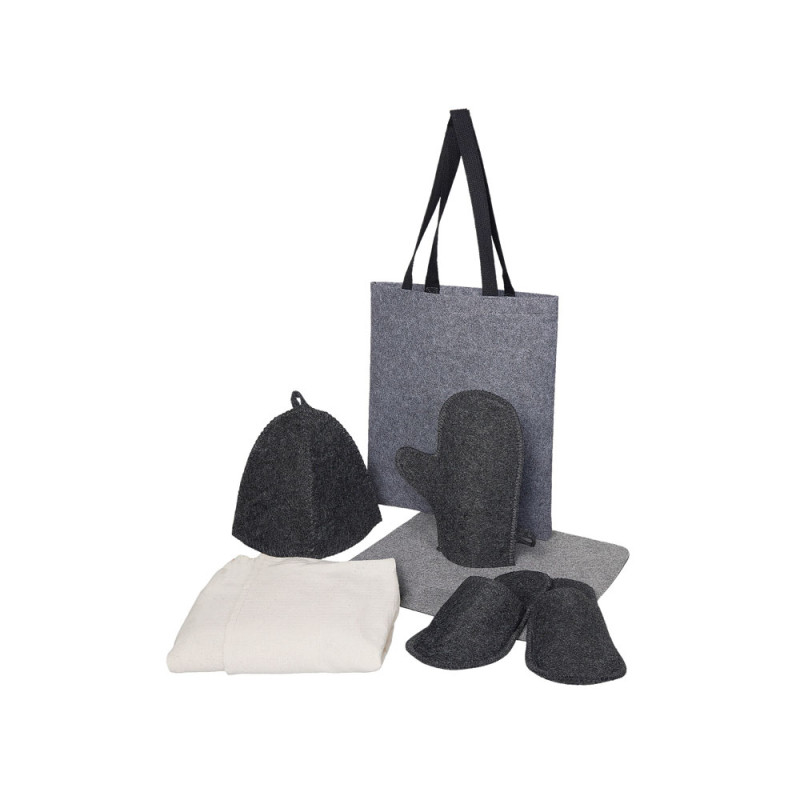 Женский банный набор Healing для комфортного отдыха: лежак для бани, холщовый килт-парео, рукавица, шапка и тапочки — всё аккуратно упаковано в стильный фетровый шоппер.
