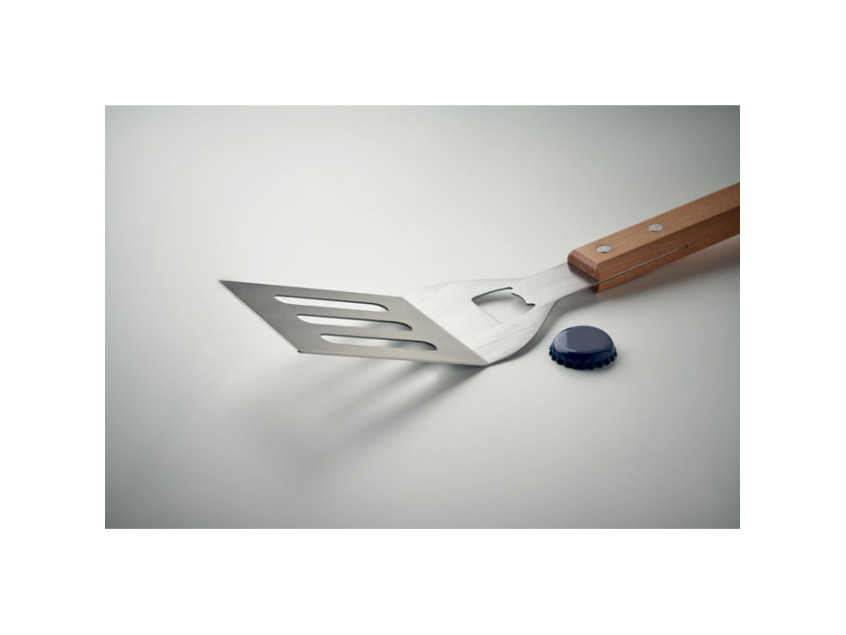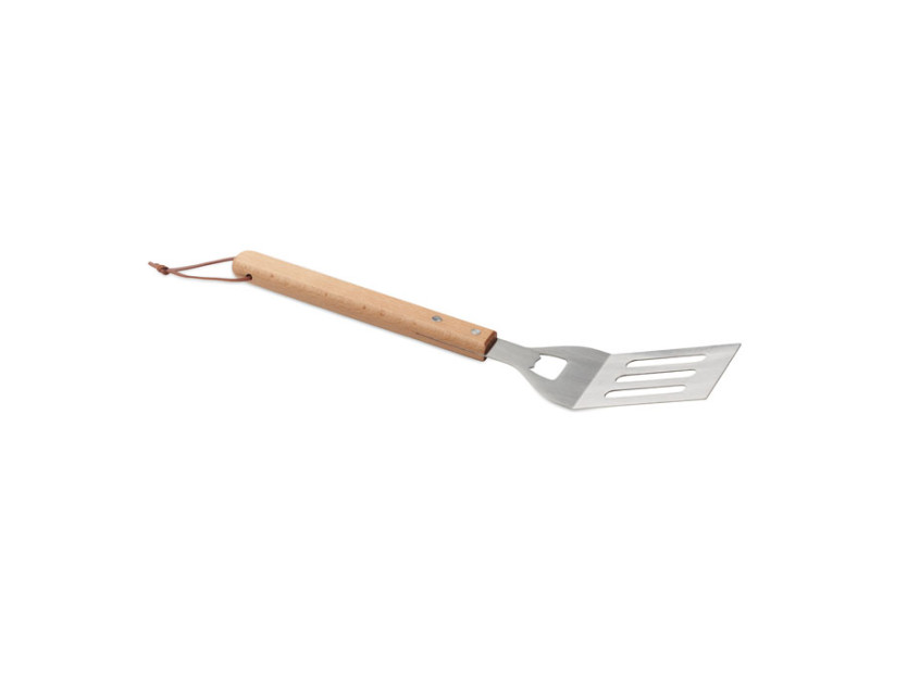 Лопатка для барбекю из нержавеющей стали с ручкой из бука и встроенной открывалкой для бутылок. В комплекте ремешок для удобного хранения.