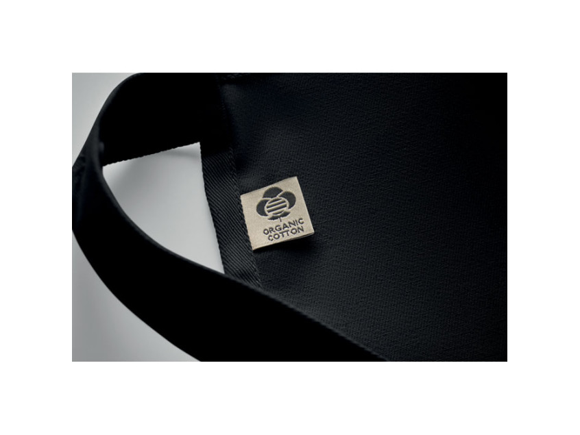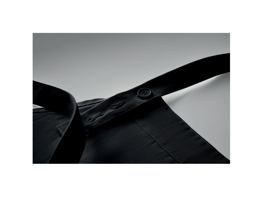 Adjustable bib apron with 1 large front pocket with 2 compartments in 240 gr/m² organic cotton. With adjustable button on the neck strap.