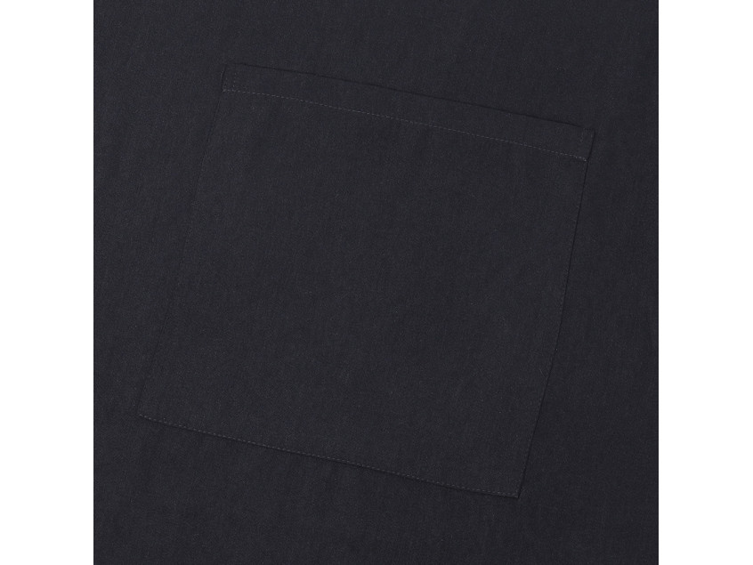 Фартук классического кроя с лямкой через шею, глубоким накладным карманом и поясом из двух частей.