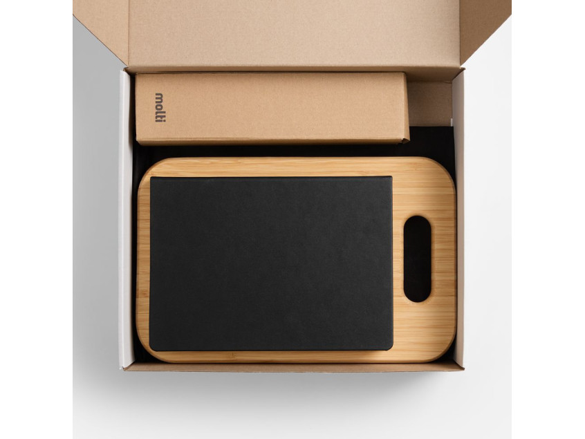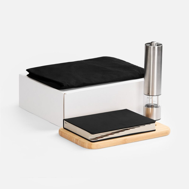 | Материал: | мельница - нержавеющая сталь; пластик; фартук - хлопок 100%, плотность 240 г/м²; ежедневник - покрытие софт-тач; доска - бамбук; коробка - микрогофрокартон, Т-23Е |