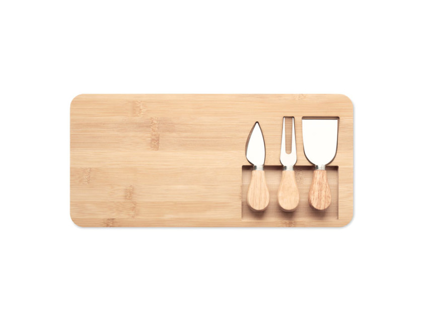Бамбуковая сервировочная доска для сыра с 2 ножами и вилкой.
