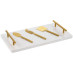 В центре внимания — кварцевая доска с золотистыми ручками, которая не только выглядит роскошно, но и обеспечивает устойчивость благодаря специальным «ножкам». Ее гладкая поверхность идеально подходит для нарезки и сервировки, а стильные ножи из нержавеющей стали станут вашими верными помощниками. Каждый из трех ножей разработан для определенного типа сыра: мягкого, полутвердого или твердого. Нож-лопатка с легкостью справляется с нарезкой и сервировкой, сохраняя эстетичный вид ломтиков, а нож с раздвоенным кончиком идеален для раскрошения твердых сортов.