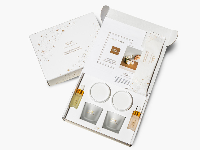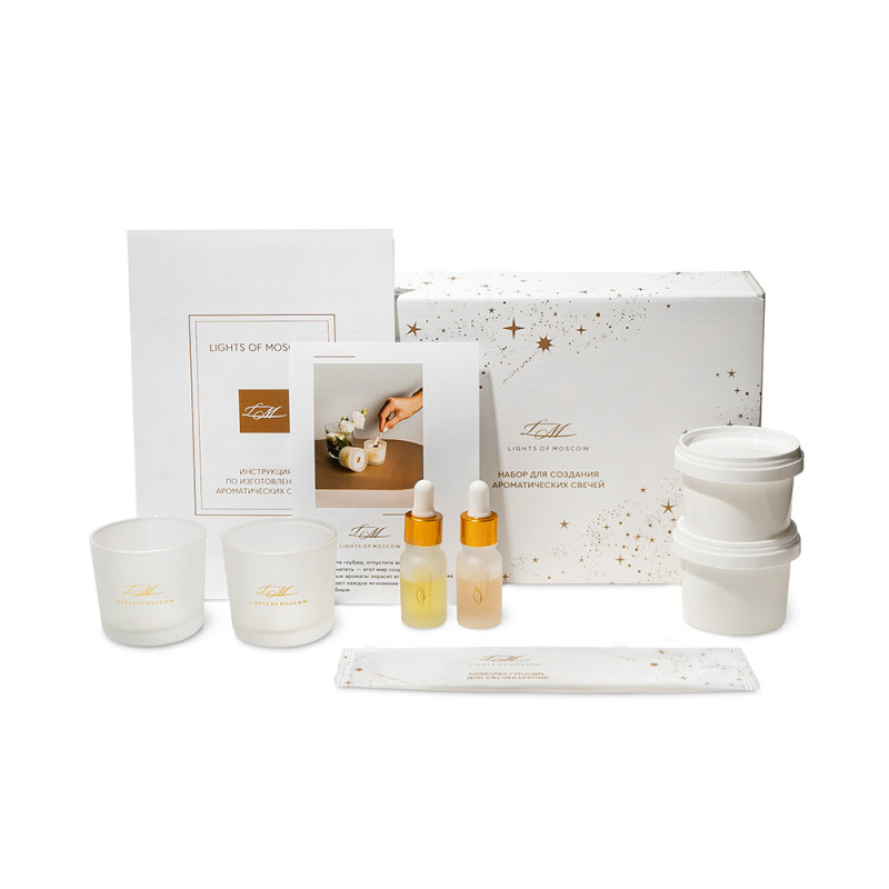 Уникальный набор для изготовления ароматических свечей станет приятным подарком и погрузит в увлекательный процесс. Набор выполнен в подарочной коробке с ложементом, в него входят все необходимые компоненты и подробная инструкция. Откройте для себя удивительный мир ароматов с Lights of Moscow! Вы сможете создать две невероятные композиции, которые точно понравятся Вам и Вашим близким! Условия хранения: — Свечи: +18…+24 °C, вдали от источников тепла, сквозняков и прямых солнечных лучей. — Рекомендуемая влажность — не более 50%. — Избегайте длительного воздействия яркого света. В комплекте: Подарочная брендированная коробка с ложементом - 1 шт. Стакан стеклянный матовый с тиснением логотипа LM 100 мл - 2 шт. Контейнер с соевым воском – 2 шт. Флакон стеклянный матовый c тиснением логотипа LM с ароматической отдушкой – 2 шт. Деревянный фитиль с держателем – 1 шт. Хлопковый фитиль с держателем - 1 шт. Наклейка для крепления фитиля - 2 шт. Палочка для перемешивания - 2 шт. Салфетка - 1 шт. Перчатка - 1 шт. Открытка - 1 шт. Инструкция по изготовлению ароматических свечей – 1 шт.