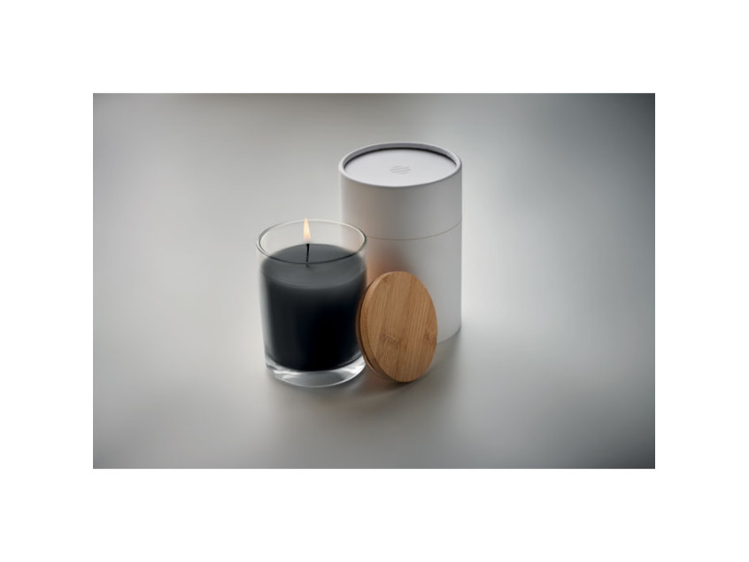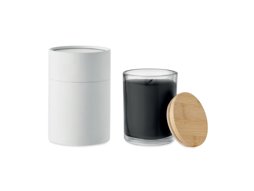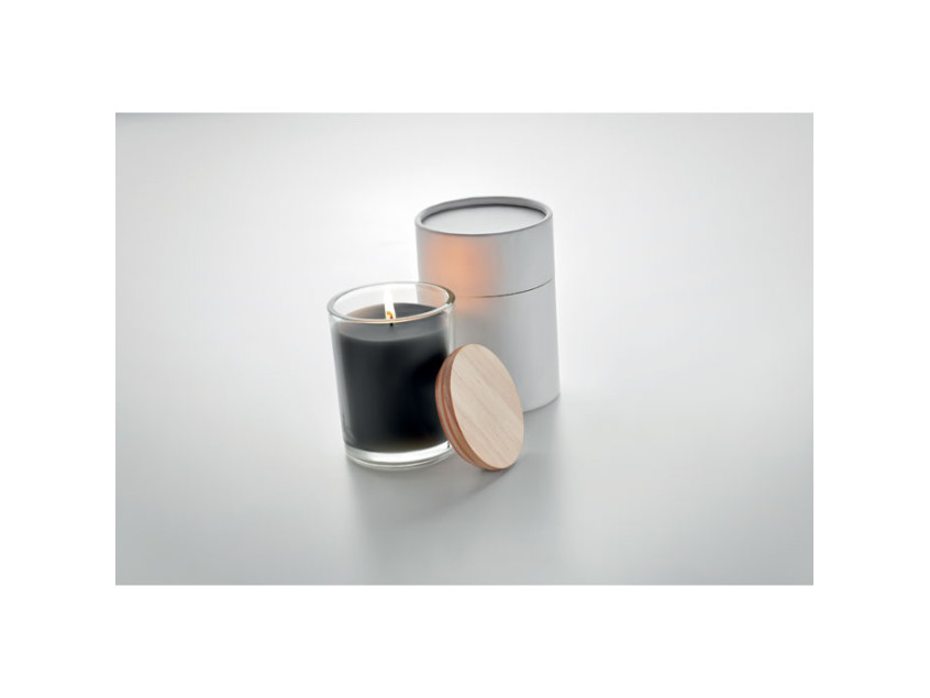 Свеча выполнена в стильном черном стеклянном стаканчике, который подчеркивает ее изысканность. Бамбуковая крышка добавляет нотку натуральности и экологичности, делая этот аксессуар не только красивым, но и практичным. После использования стаканчик можно превратить в стильную подставку для ручек или мини-вазу. А подарочная туба из бумаги делает свечу готовым презентом, который не требует дополнительной упаковки.