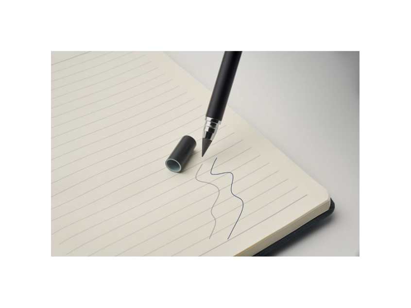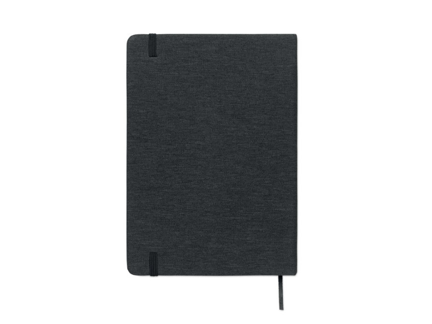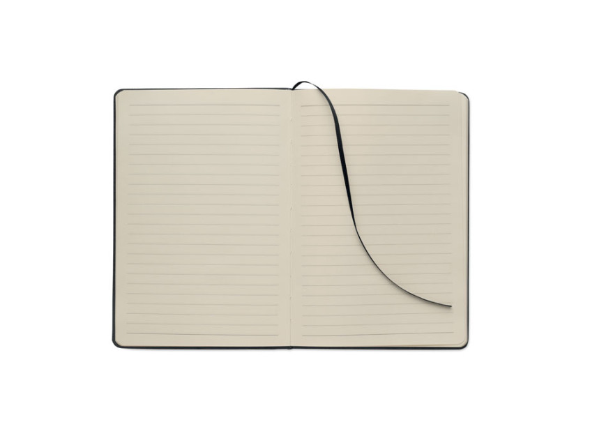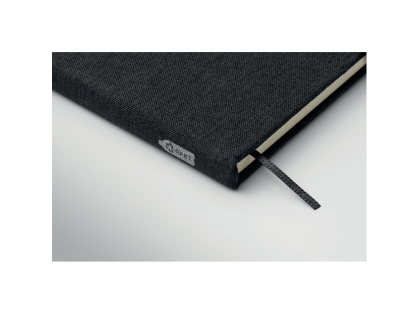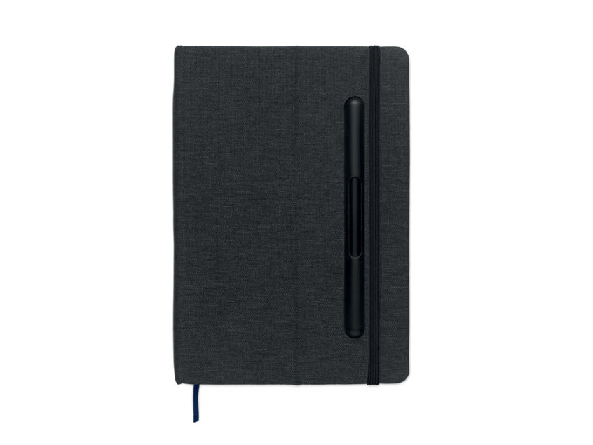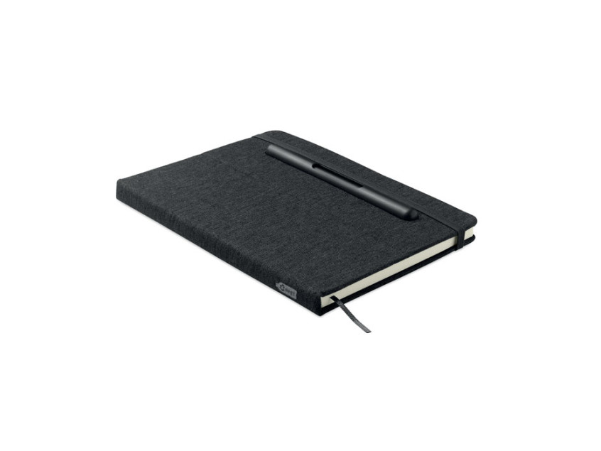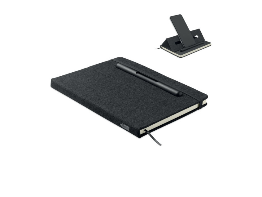 A5 notebook with RPET hard cover with phone holder functionality. Integrated 2-in-1 inkless and regular ballpen in ABS. Casebound. 192 recycled paper lined pages (96 sheets). Matching strap and bookmark. FSC®-certified | FSC MIX CREDIT, P7.1, FSC-C213206