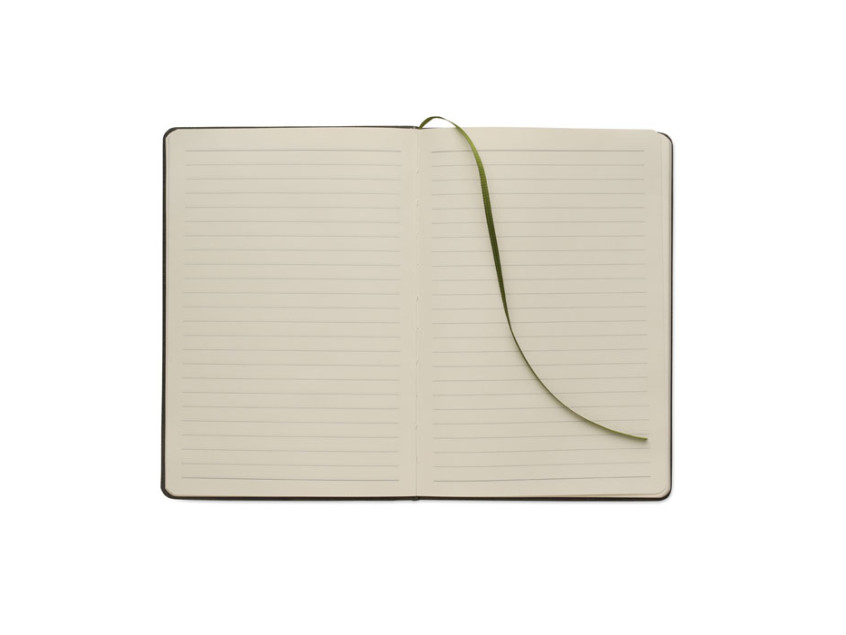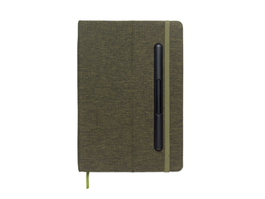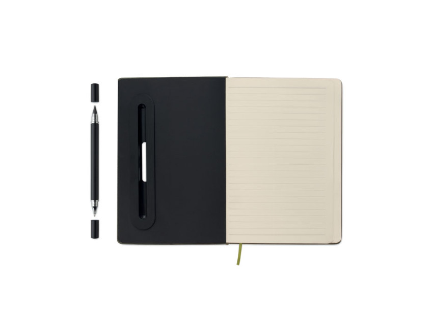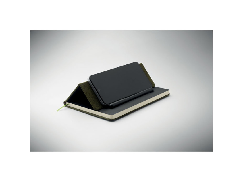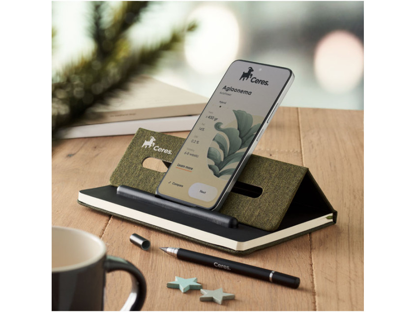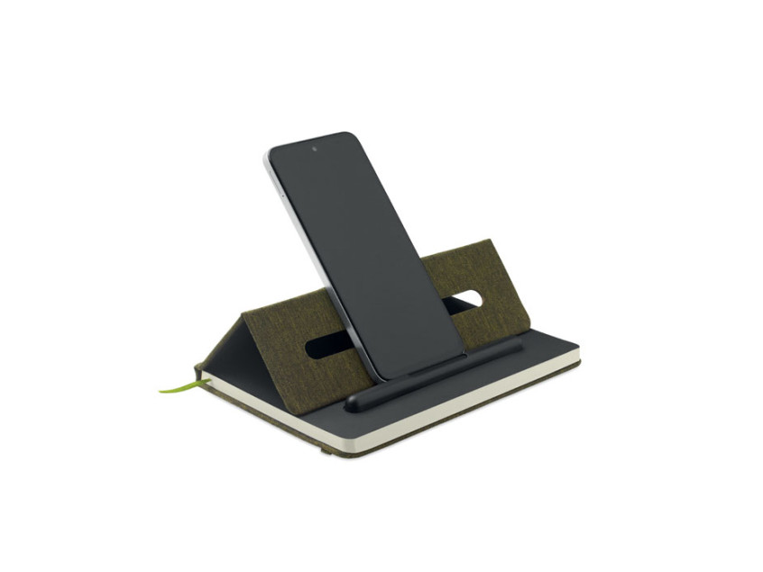 A5 notebook with RPET hard cover with phone holder functionality. Integrated 2-in-1 inkless and regular ballpen in ABS. Casebound. 192 recycled paper lined pages (96 sheets). Matching strap and bookmark. FSC®-certified | FSC MIX CREDIT, P7.1, FSC-C213206