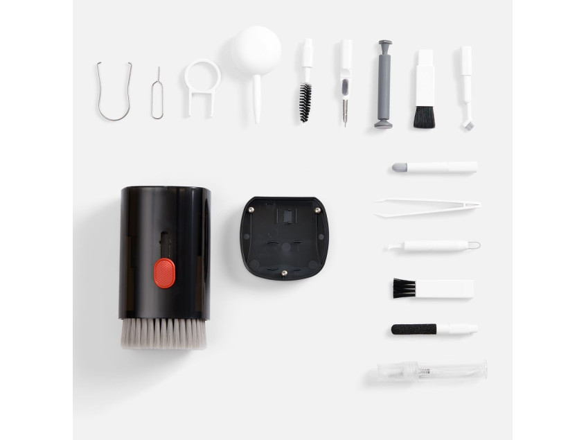 - В комплекте: большая щетка, салфетка для ухода за дисплеем, контейнер для жидкости, пластиковый пинцет, щетка с жесткой щетиной, щетка с мягкой щетиной, чистящее перо со щеткой для наушников, насадка для чистки кейса от наушников, ершик для чистки кейса от наушников, щетка с короткой щетиной, щетка с наклонной щетиной, двусторонняя насадка для чистки разъемов зарядки, двусторонняя насадка для чистки камеры, инструмент для продувки, дуговой пинцет, ключ для отсека SIM-карты, инструмент для извлечения поврежденных ключей
