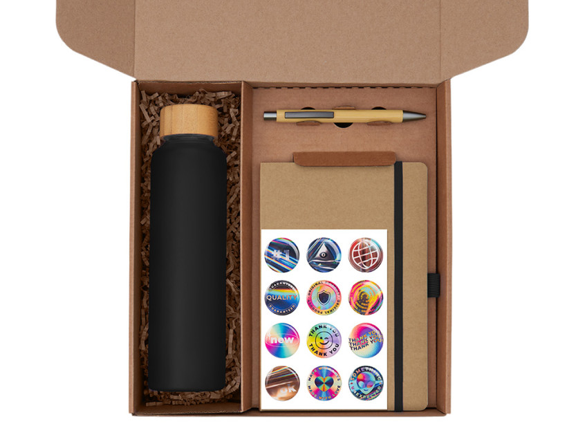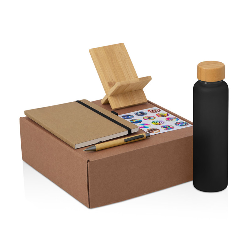 Набор Wooden станет отличным подарком для сотрудников, клиентов и партнёров, подчеркнёт внимание к их комфорту и заботу о деталях. Он уместен как корпоративный подарок на праздники, юбилеи и деловые мероприятия, так и в качестве welcome-набора для новых коллег. Набор объединяет всё необходимое для комфортного рабочего дня:  Блокнот для идей, заметок и планов на день; Ручка, которая всегда под рукой; Стеклянная бутылка для воды объемом 600 мл., чтобы поддерживать водный баланс в течение дня; Бамбуковая подставка для телефона, чтобы держать гаджет в поле зрения во время работы или видеозвонков;  Набор стикеров — для ярких акцентов и персонализации вещей Универсальный ложемент обеспечивает аккуратное размещение и надёжную фиксацию элементов, делая набор эффектным и презентабельным при вручении. Дополнительное преимущество — набор доступен в конструкторе наборов: компоненты можно заменить и собрать индивидуальный вариант под стиль компании или вкусы получателя.