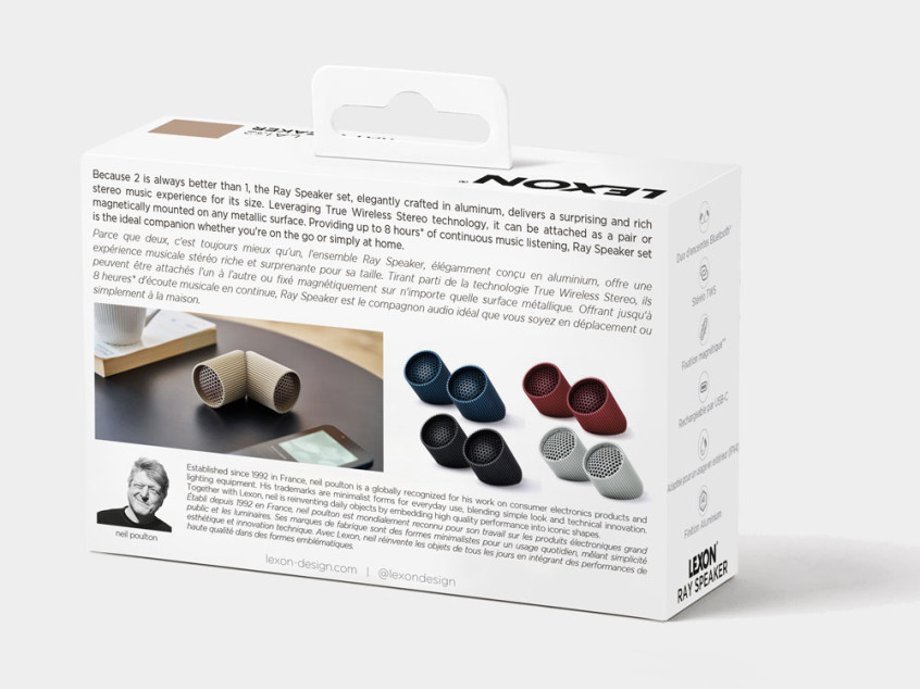 Ray Speaker — это дуэт магнитных Bluetooth®-колонок, удостоенных наград Red Dot Design Award и IF Design Award. Обеспечивая захватывающий стереозвук благодаря технологии True Wireless Stereo, эти колонки легко крепятся друг к другу или к любой магнитной поверхности, что делает их идеальными для использования дома или в дороге. Помимо прослушивания музыки, Ray Speaker позволяет совершать звонки без помощи рук и дистанционно делать селфи. Благодаря аккумулятору, работающему до 8 часов, и элегантному алюминиевому корпусу, они добавят современный штрих в ваш интерьер, а степень водонепроницаемости IPX4 позволяет использовать их на улице. Доступны различные цвета, которые дополнят ваш стиль.