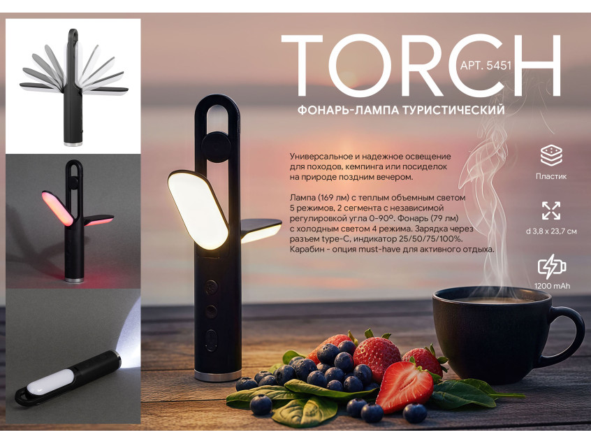 Лампа с теплым объемным светом 5 режимов, 2 сегмента с независимой регулировкой угла 0-90º. Фонарь с холодным светом 4 режима, направленный луч для построения маршрута. Встроенная батарея емкостью 1200 mAh, зарядка через разъем type-C, индикатор 25/50/75/100%.