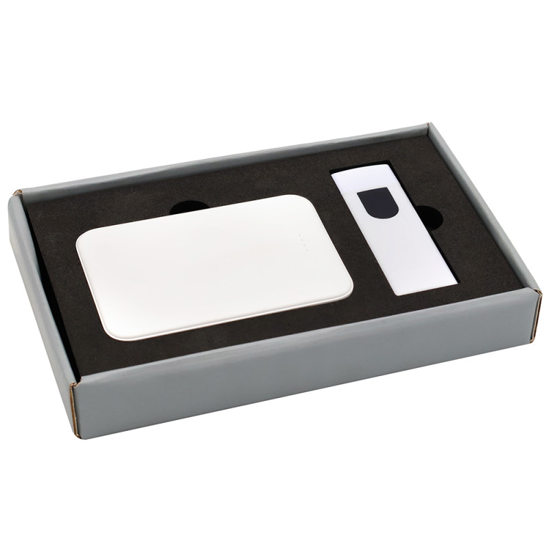 Подарочный набор в стильной цветной картонной коробке серого цвета (крышкой-дно). Внутри на аккуратном ложементе расположены внешний аккумулятор емкостью 5000 mAh и электронная зажигалка. Компактный и мощный внешний аккумулятор обеспечивает надежное подзаряжание мобильных устройств в любое время, а современная электронная зажигалка сочетает в себе удобство и безопасное использование без огня. Этот набор станет практичным и элегантным подарком для людей, ценящих функциональность и стиль.