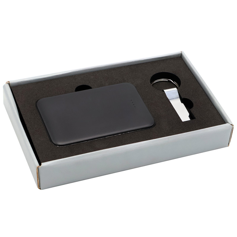 Подарочный набор в стильной цветной картонной коробке серого цвета (крышкой-дно). Внутри на аккуратном ложементе располагаются внешний аккумулятор емкостью 5 000 mAh и элегантная флэшка емкостью 16 ГБ в прочном металлическом корпусе. Мощный аккумулятор обеспечивает быстрое и надежное подзаряжание мобильных устройств в любых условиях, а флэшка сочетает вместительность и изысканный дизайн, надежно защищая ваши данные. Этот комплект станет отличным подарком для современных и активных людей, ценящих качество, функциональность и стиль.