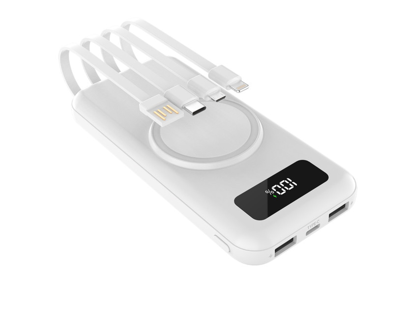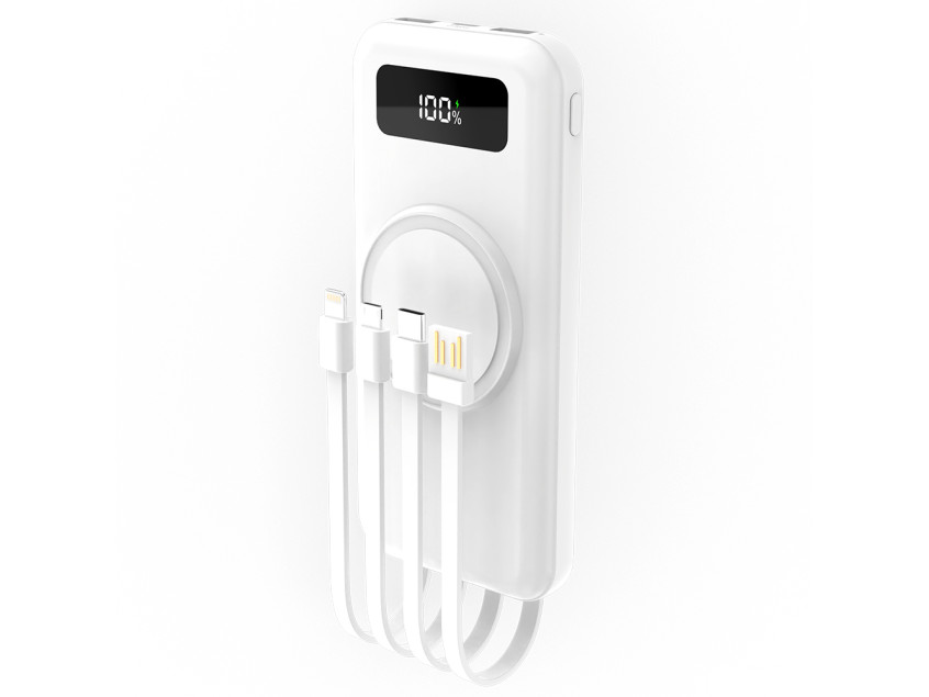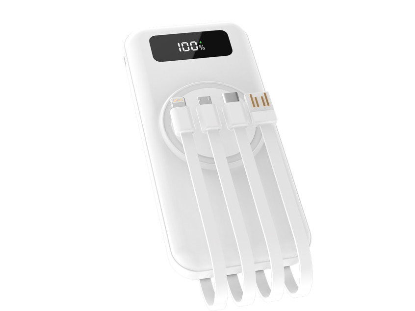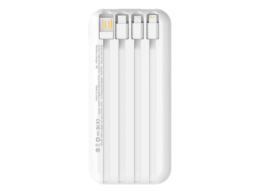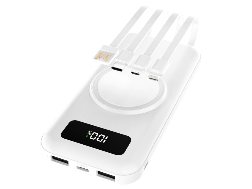 Инновационный дизайн корпуса включает встроенные кабели питания — Micro-USB, Lightning и Type-C (5V/2A), что избавляет вас от необходимости носить с собой лишние кабели и обеспечивает максимально быстрое подключение. Усиленная батарея, рассчитанная на более чем 500 циклов зарядки и разрядки, гарантирует долгий срок службы и стабильную работу устройства.