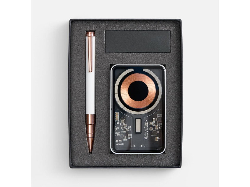 Компактный аккумулятор Cooper Ergo с премиальным корпусом и привлекательной электронной «начинкой» под прозрачной панелью в сочетании с увесистой шариковой ручкой Kugel Rosegold станут идеальным подарком как для коллег, так и для руководителей.