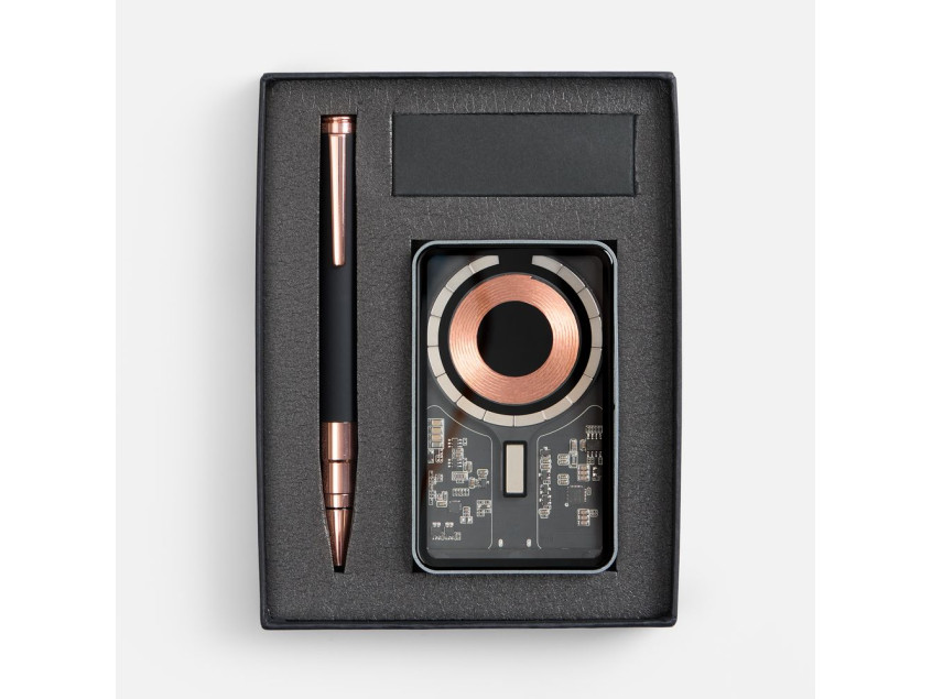 Компактный аккумулятор Cooper Ergo с премиальным корпусом и привлекательной электронной «начинкой» под прозрачной панелью в сочетании с увесистой шариковой ручкой Kugel Rosegold станут идеальным подарком как для коллег, так и для руководителей.