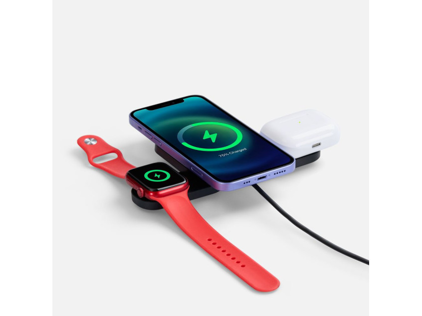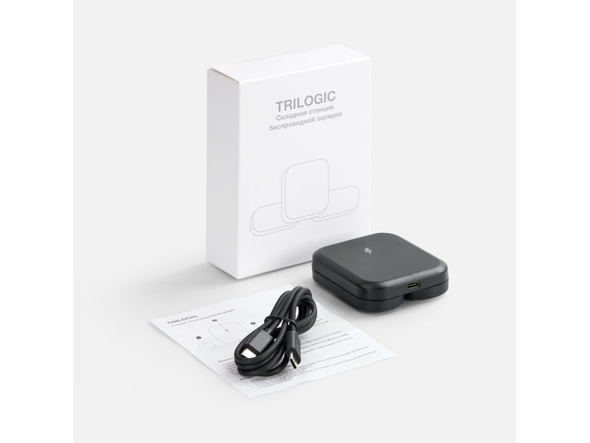 Trilogic — компактное устройство беспроводной зарядки для самых мобильных и современных пользователей. Площадки для зарядки наушников и часов легко складываются и не занимают места, когда не используются. Поэтому станцию удобно использовать не только в офисе, но и находясь в дороге.