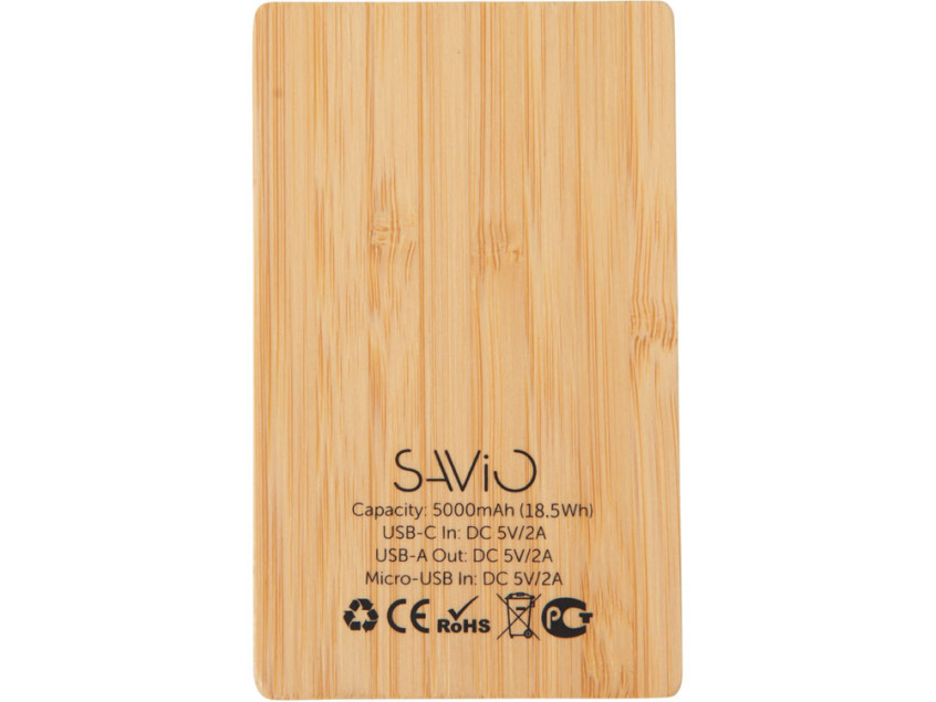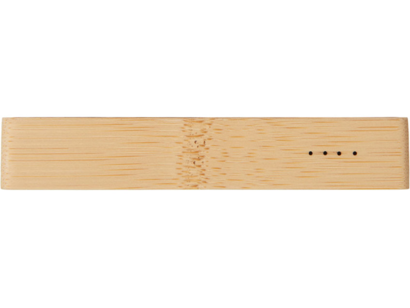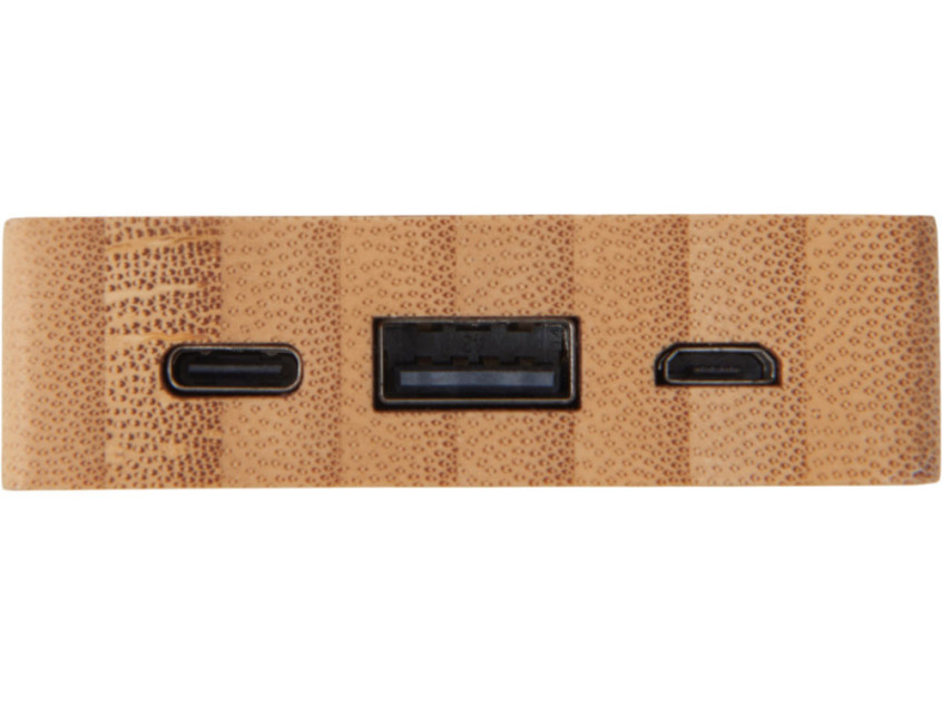 Компактный и стильный внешний аккумулятор ёмкостью 5 000 мАч — идеальный спутник для повседневных дел и коротких поездок. Его корпус сочетает в себе натуральный бамбук и переработанный ABS-пластик, что делает устройство не только более экологичным, но и визуально премиальным. Особый шарм ему придаёт встроенная панель с белой подсветкой с возможностью нанесения логотипа — ваш бренд или инициалы мягко засветятся в темноте, привлекая внимание и подчеркивая индивидуальность. Это не просто power bank — это экосознательный аксессуар, который заряжает ваши гаджеты и вдохновляет окружающих.