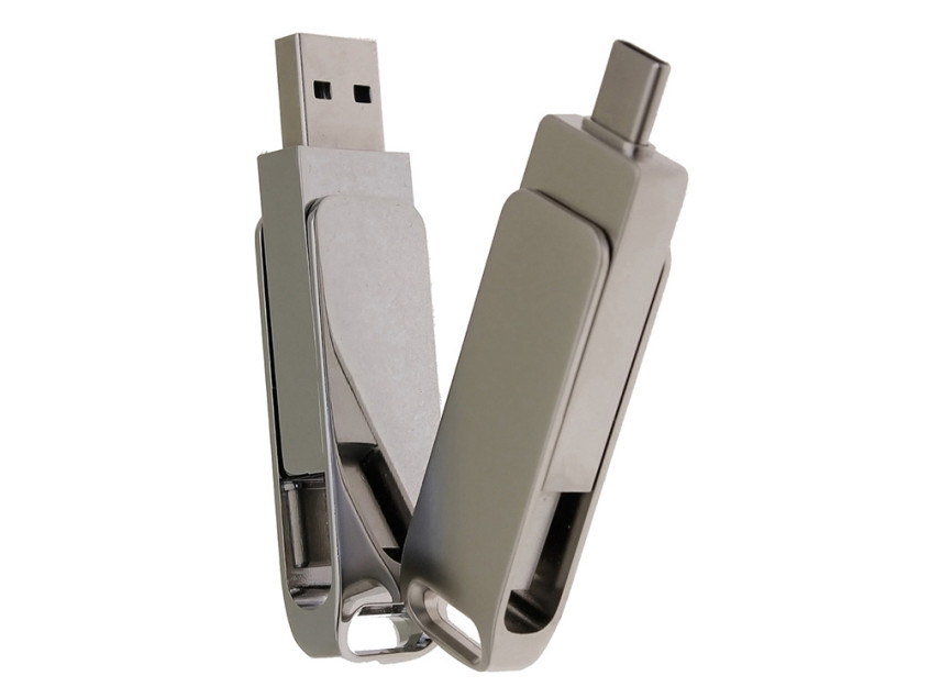 Флеш-накопитель поворотный механизм, c дополнительным разъемом Type-C с одноцветным металлическим клипом, объем памяти USB3 16 Гб. Металлический корпус.