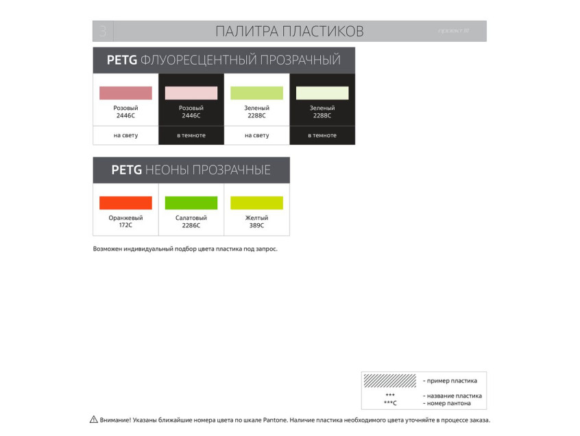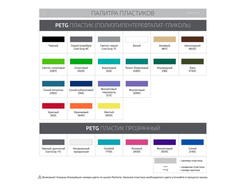 Отправляя запрос, укажите в поле «Примечание» формы заказа цвет пластика. Варианты цветов можно посмотреть в разделе «Фотографии».