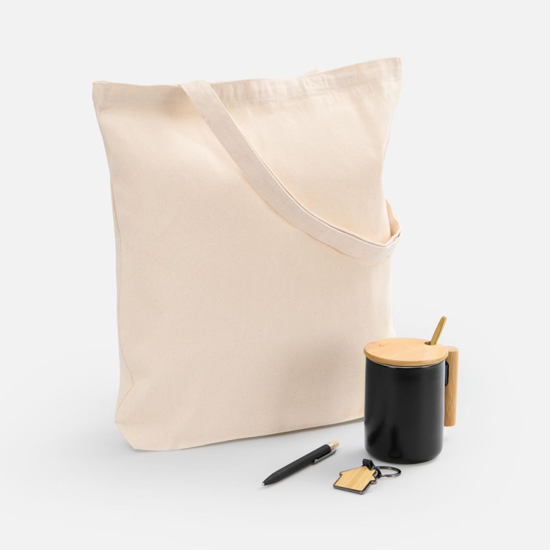 В комплекте: стильная кружка с ручкой и крышкой из бамбука, вместительная холщовая сумка, брелок с бамбуковой вставкой и шариковая ручка с бамбуковой кнопкой — для вдохновенных идей и продуктивных дней!
