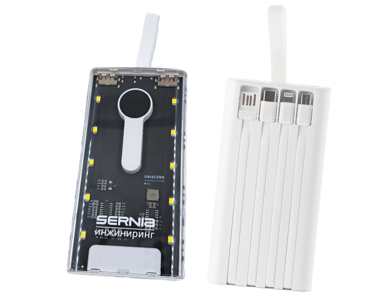 Аккумулятор с быстрой зарядкой и встроенными кабелями, 10000 мАч. Вид нанесения: УФ-печать