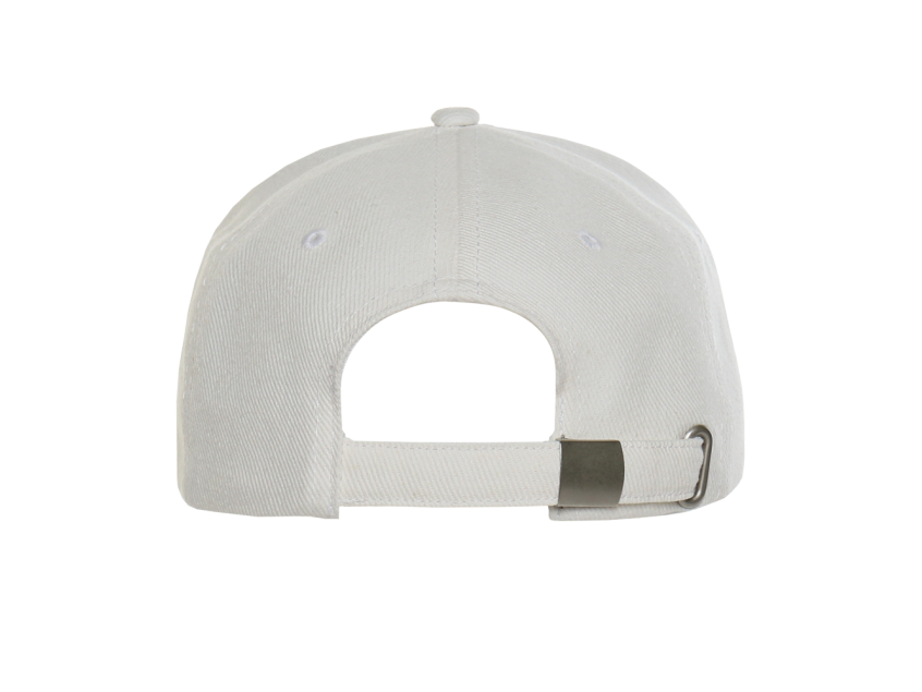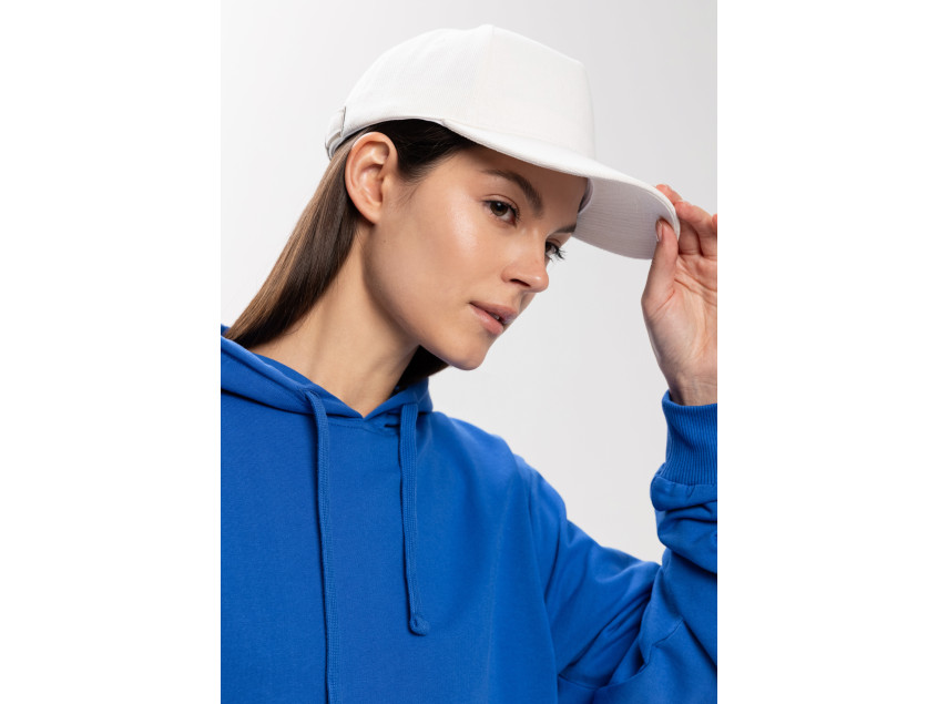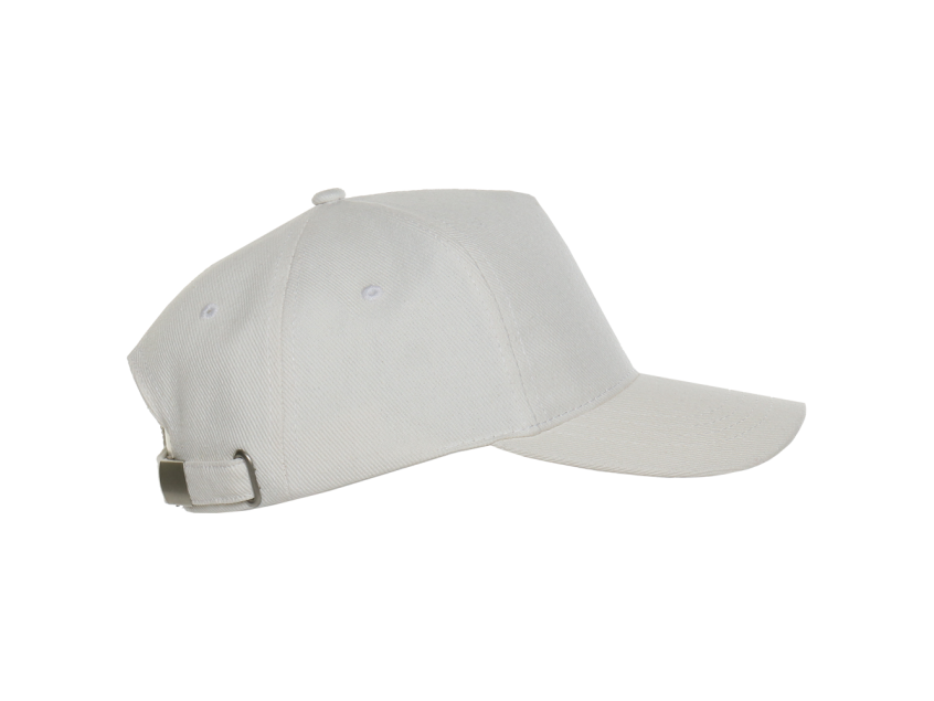 Бейсболка-пятиклинка без лобового шва с изогнутым жестким козырьком и регулируемой металлической застежкой.