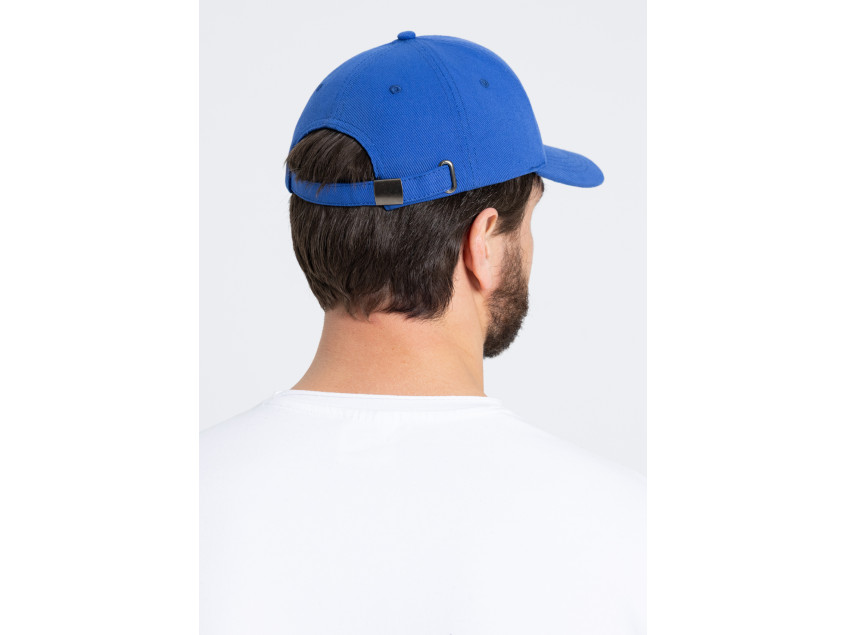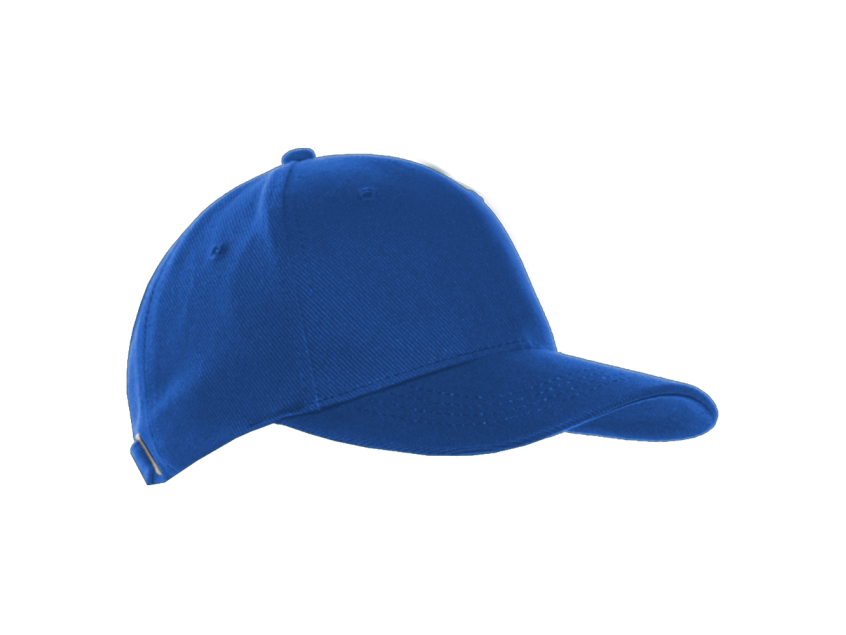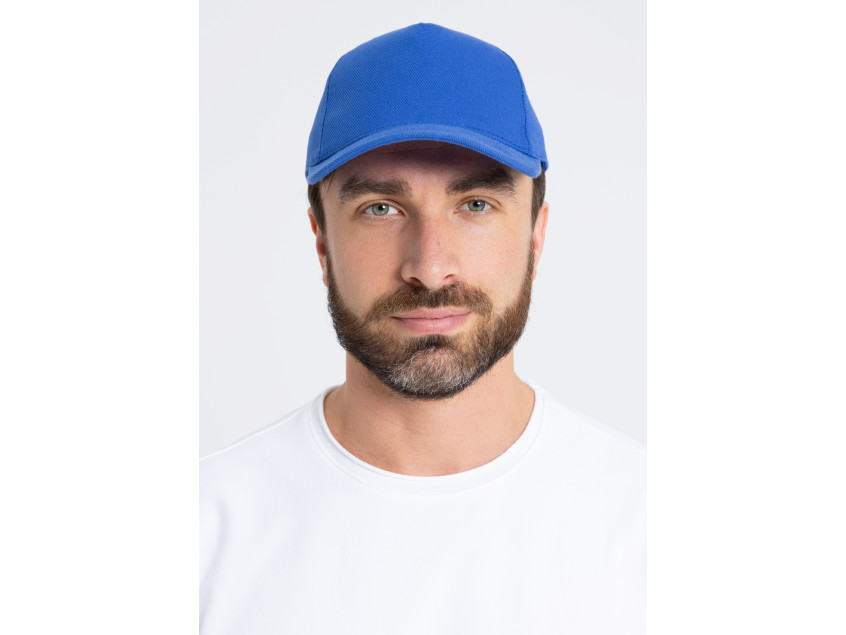 Бейсболка-пятиклинка без лобового шва с изогнутым жестким козырьком и регулируемой металлической застежкой.