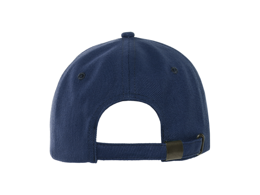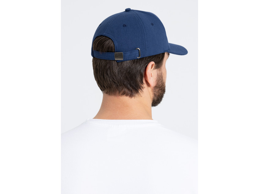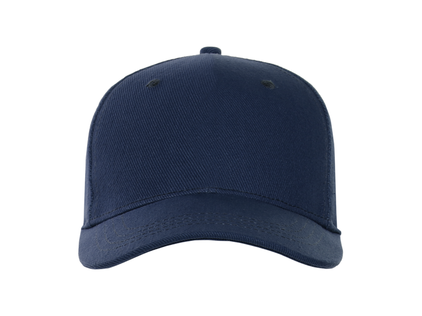 Бейсболка-пятиклинка без лобового шва с изогнутым жестким козырьком и регулируемой металлической застежкой.