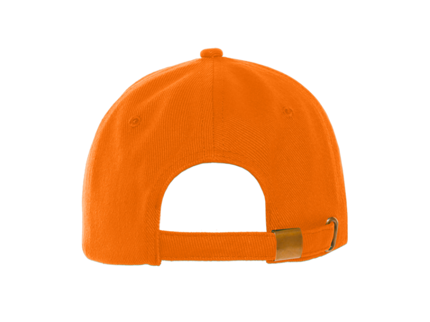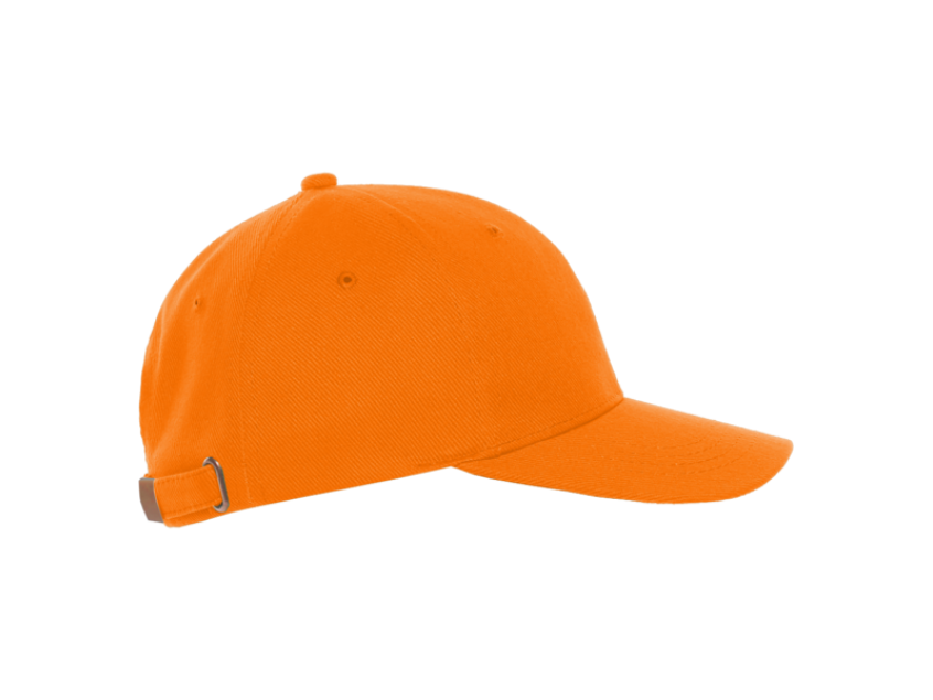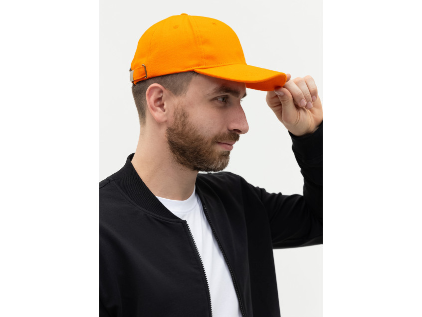 Бейсболка-шестиклинка с изогнутым жестким козырьком, прилегание регулируется ремешком с металлической застежкой.