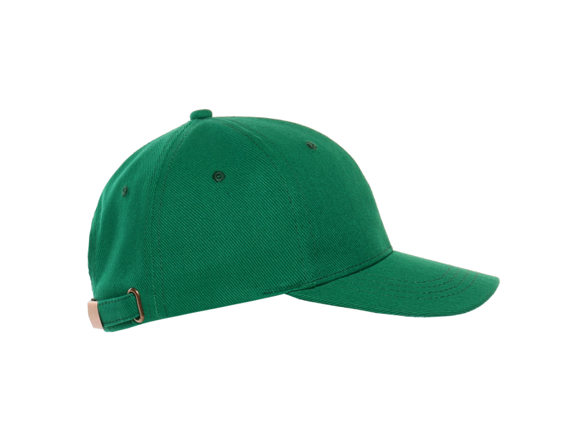 Бейсболка-шестиклинка с изогнутым жестким козырьком, прилегание регулируется ремешком с металлической застежкой.