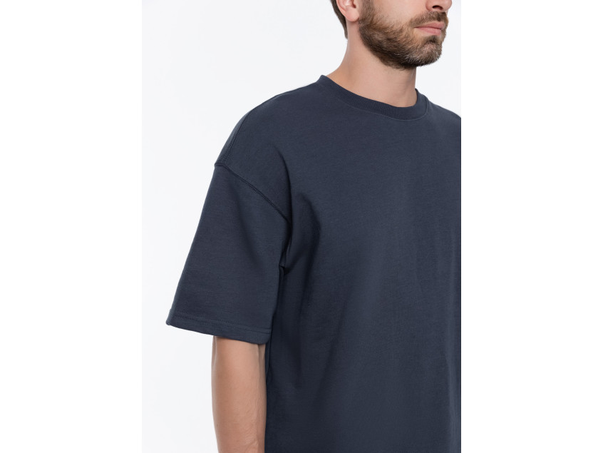 Футболка свободного кроя с округлым воротом и спущенной линией плеча. Шов горловины спинки усилен киперной лентой в тон основному цвету. Универсальная модель идеально впишется как в мужской, так и в женский гардероб.