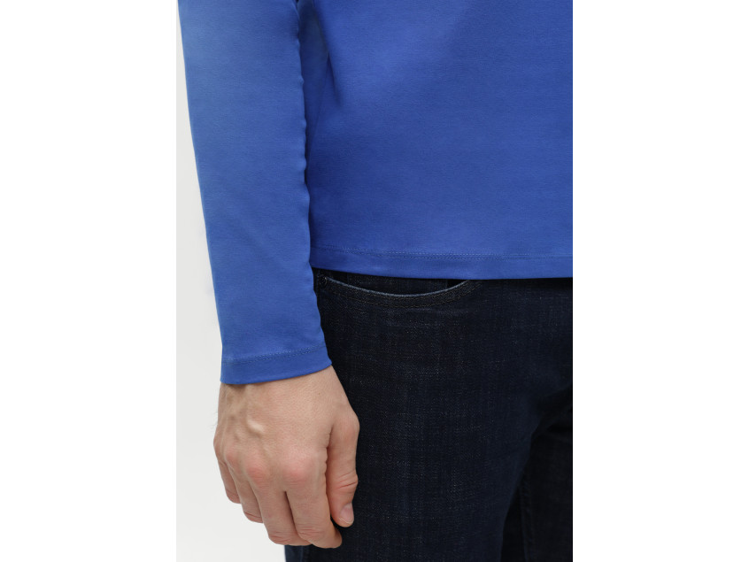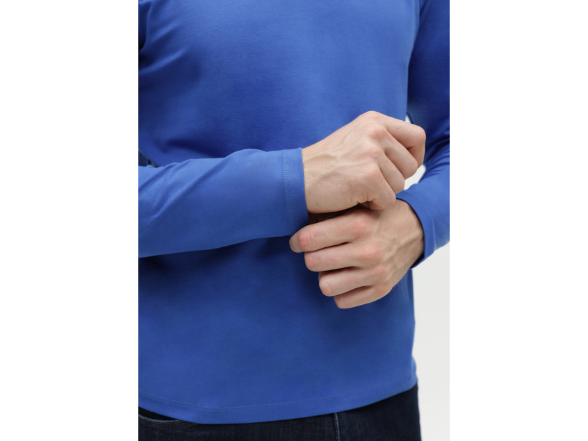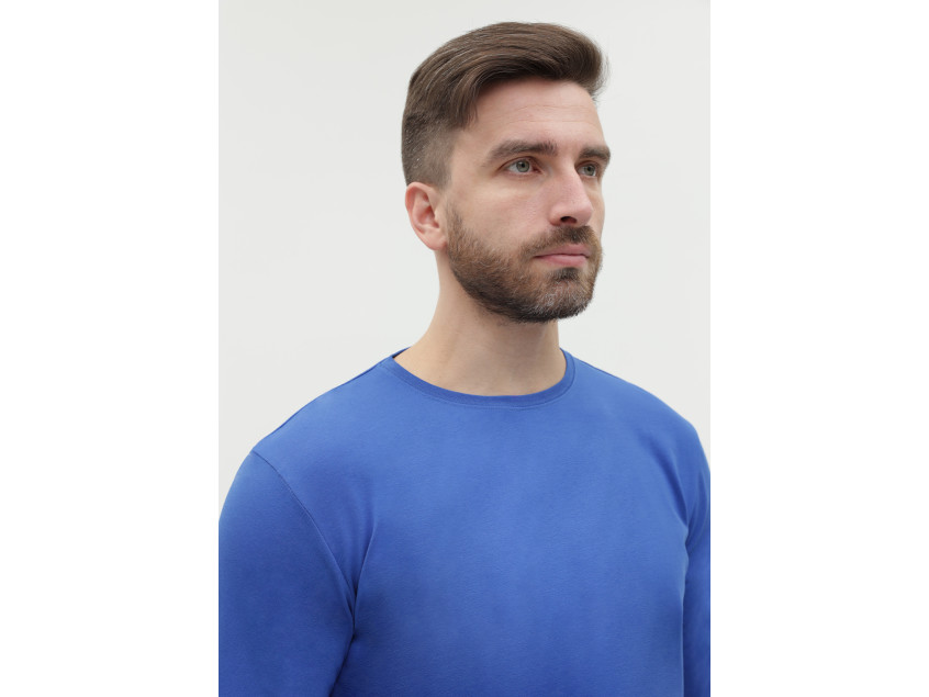 Универсальная футболка прямого силуэта с округлым воротом и длинным втачным рукавом. Плечевые швы и шов горловины усилены настрочной бейкой из основного полотна.