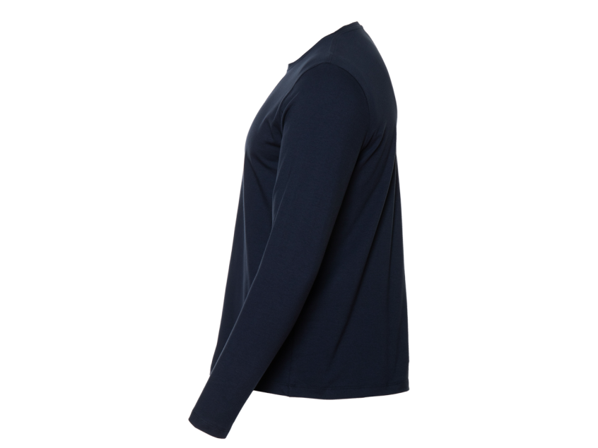Универсальная футболка прямого силуэта с округлым воротом и длинным втачным рукавом. Плечевые швы и шов горловины усилены настрочной бейкой из основного полотна.