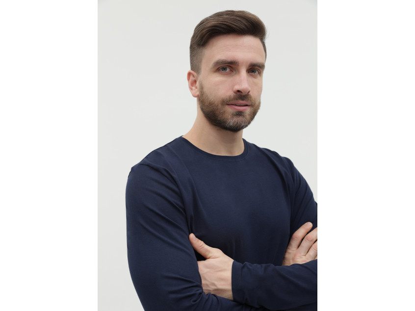 Универсальная футболка прямого силуэта с округлым воротом и длинным втачным рукавом. Плечевые швы и шов горловины усилены настрочной бейкой из основного полотна.