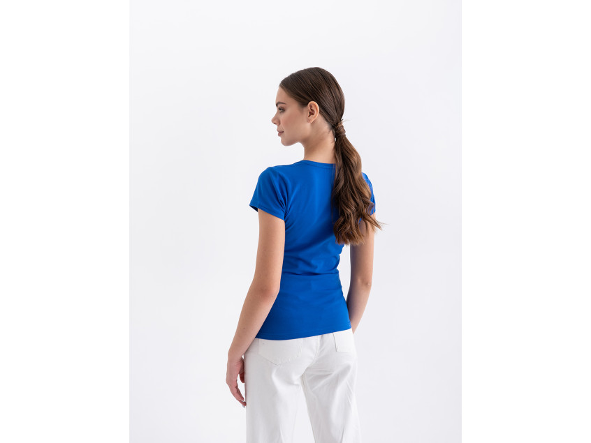 Женская футболка облегающего силуэта с V-образным воротом и втачным рукавом с плотным трикотажным манжетом.