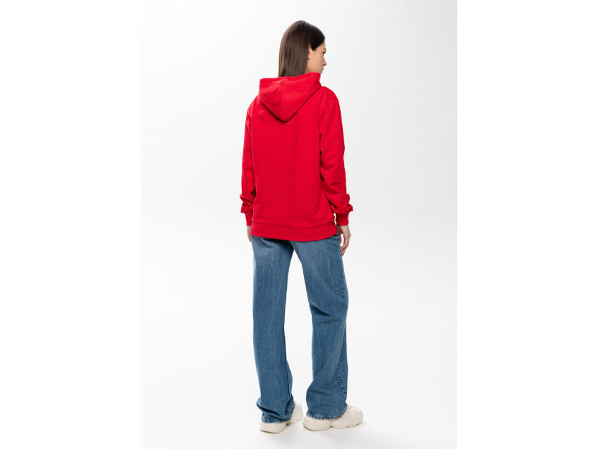 Толстовка прямого силуэта с капюшоном, втачным рукавом и карманом-кенгуру. Капюшон дополнен шнурком для регулирования прилегания, манжет и низ изделия оформлены широкой эластичной резинкой. Возможно два варианта исполнения: контрастные шнурок и бейка/шнурок и бейка в цвет толстовки.
