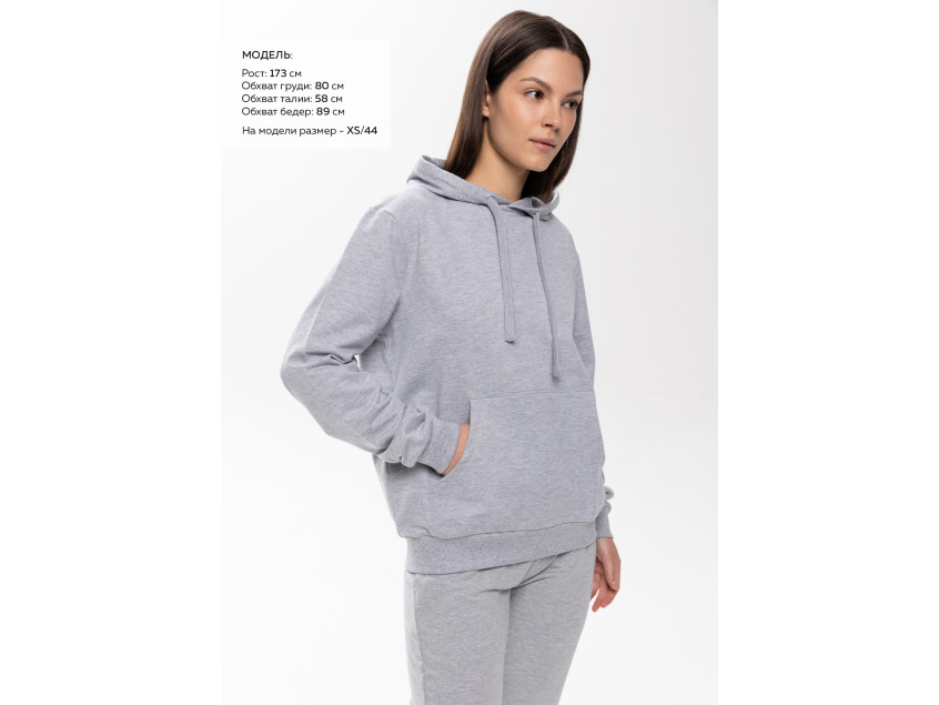 Размер женского худи: XS/44. Параметры модели: рост 173 см.; обхват груди 80 см.; обхват талии 58 см.; обхват бедер 89 см.