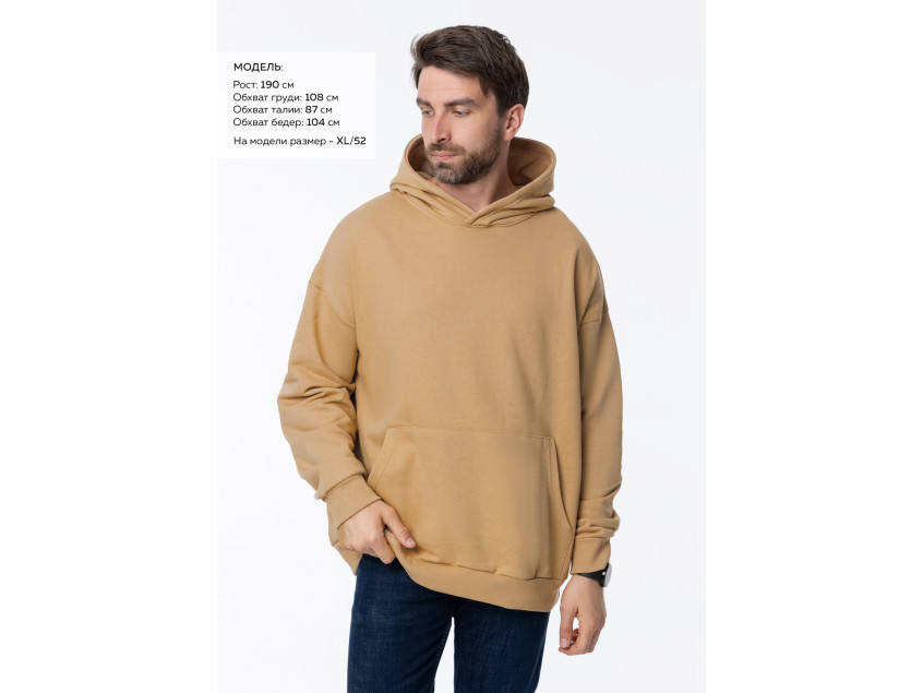 Размер мужского худи: XL/52. Параметры модели: рост 190 см.; обхват груди 108 см.; обхват талии 87 см.; обхват бедер 104 см.