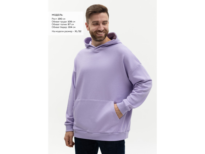 Размер мужского худи: XL/52. Параметры модели: рост 190 см.; обхват груди 108 см.; обхват талии 87 см.; обхват бедер 104 см.