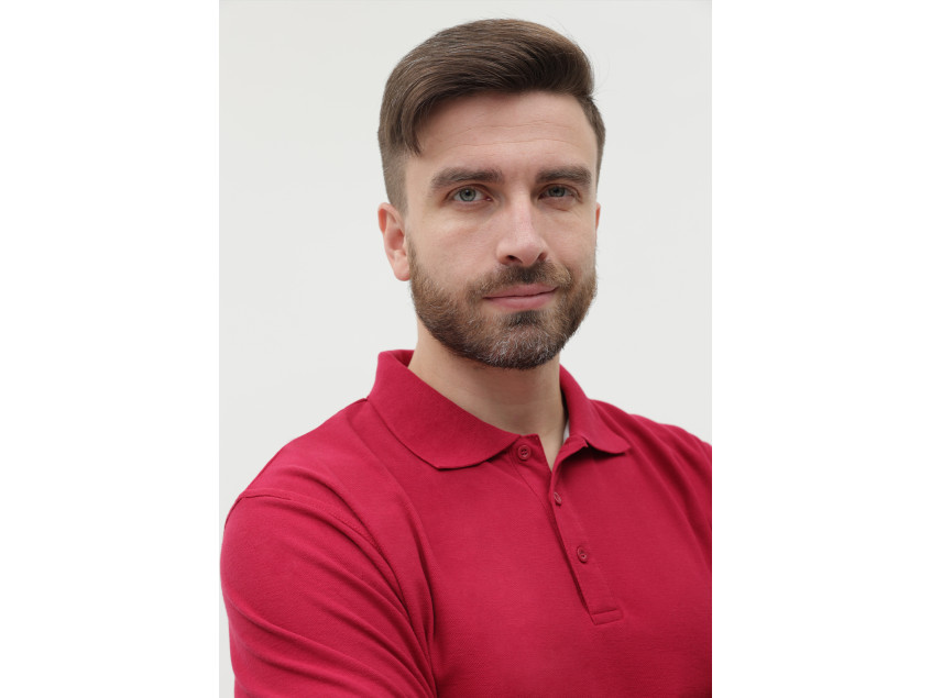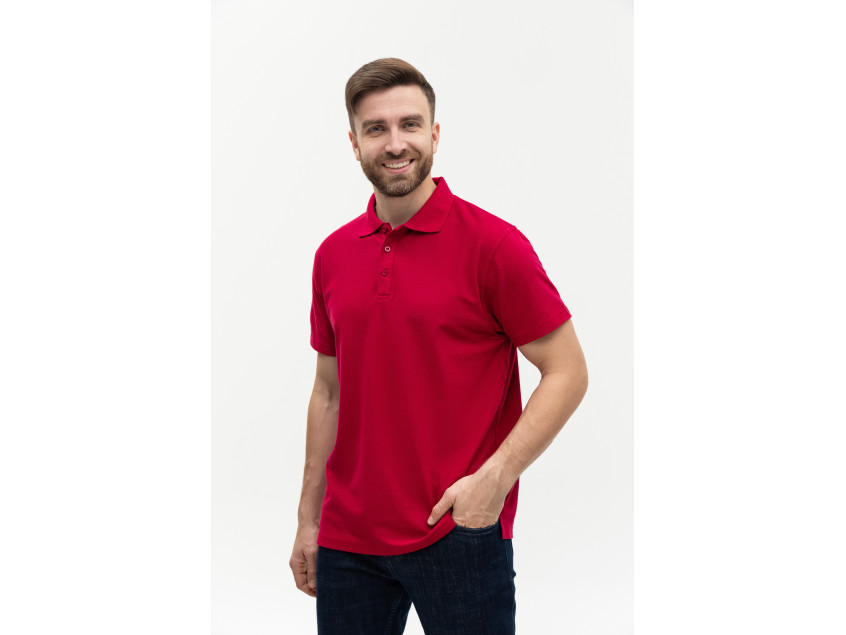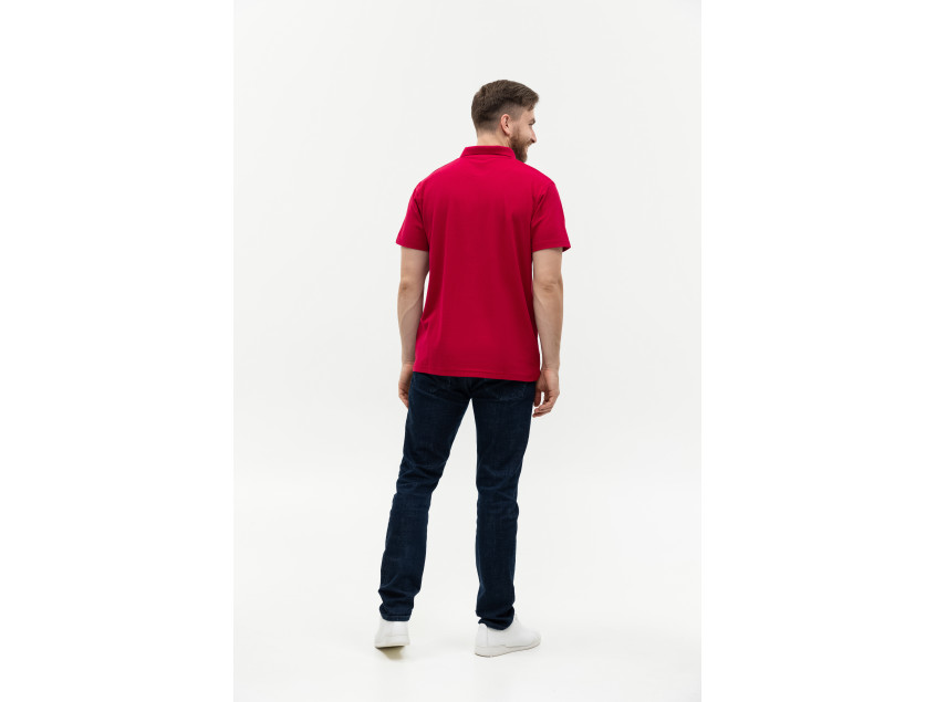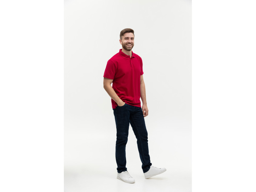 Поло выполнено из фактурной смесового ткани (65% хлопок, 35% полиэстер), благодаря чему изделие хорошо пропускает воздух и практически не мнется.
