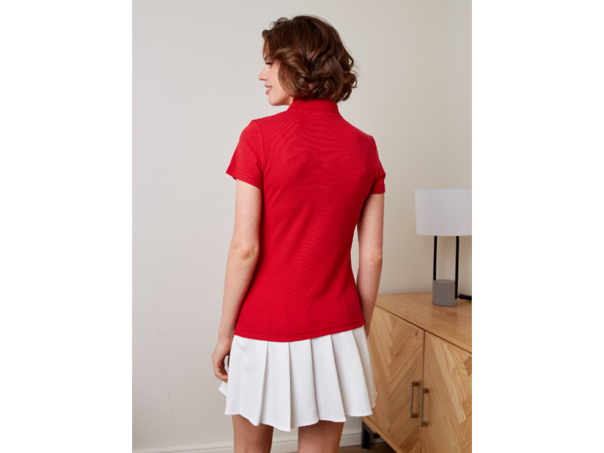 Женская рубашка поло приталенного силуэта с отложным воротником, втачным коротким рукавом и застежкой на пуговицы.