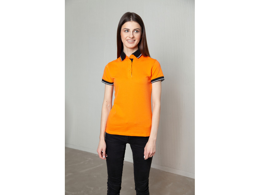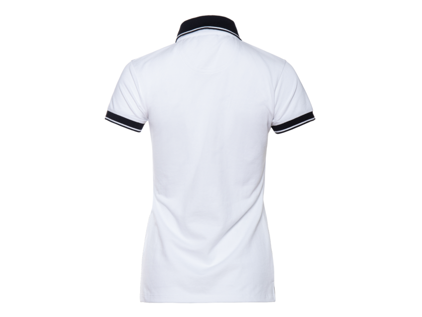 Женская рубашка поло приталенного силуэта с контрастным отложным воротником и манжетом, втачным коротким рукавом и застежку на пуговицы. Асимметричный крой гарантирует свободу движения и защиту спины от продувания ветром.